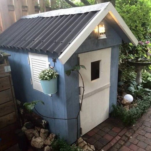 Een speelhuisje in de tuin, gemaakt van steigerhout.